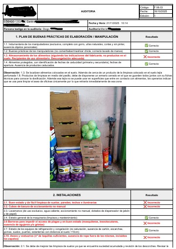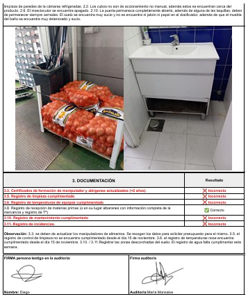 - Evidencia Visual Irrefutable: El auditor ya no solo marca una casilla. Como vemos en el reporte, si hay «alimentos en el suelo», el sistema captura la foto, la geolocaliza y la estampa en el informe. Una imagen vale más que mil discusiones.